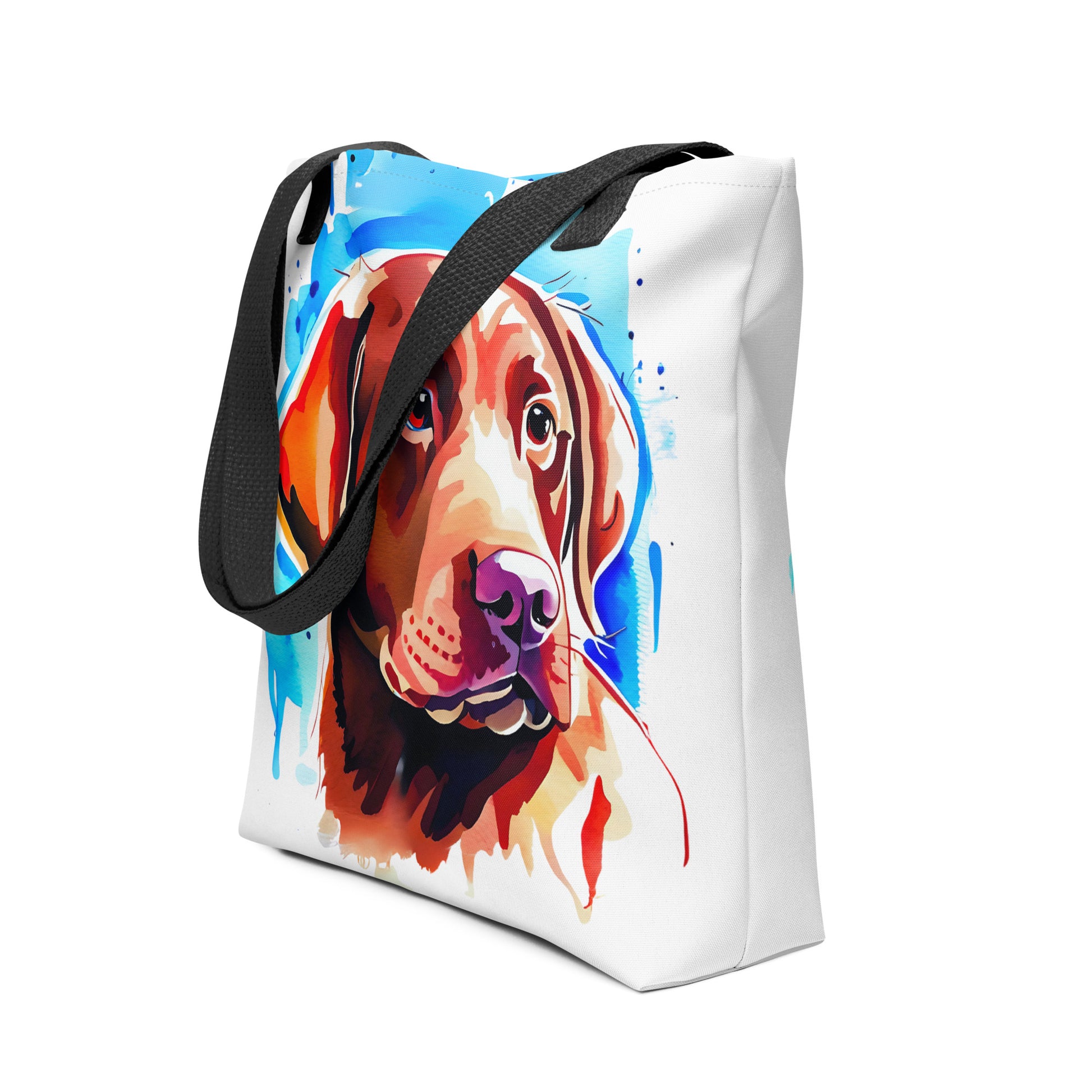 Add style and loyalty to your day with the Chocolate Labrador Watercolor Tote Bag. Featuring a beautifully painted chocolate lab in a bold watercolor art style, this tote stands out with vibrant splashes of blue and red against a clean white background. The soulful eyes and warm expression capture the devoted nature of this beloved breed, making it the perfect accessory for dog lovers and art enthusiasts alike.
